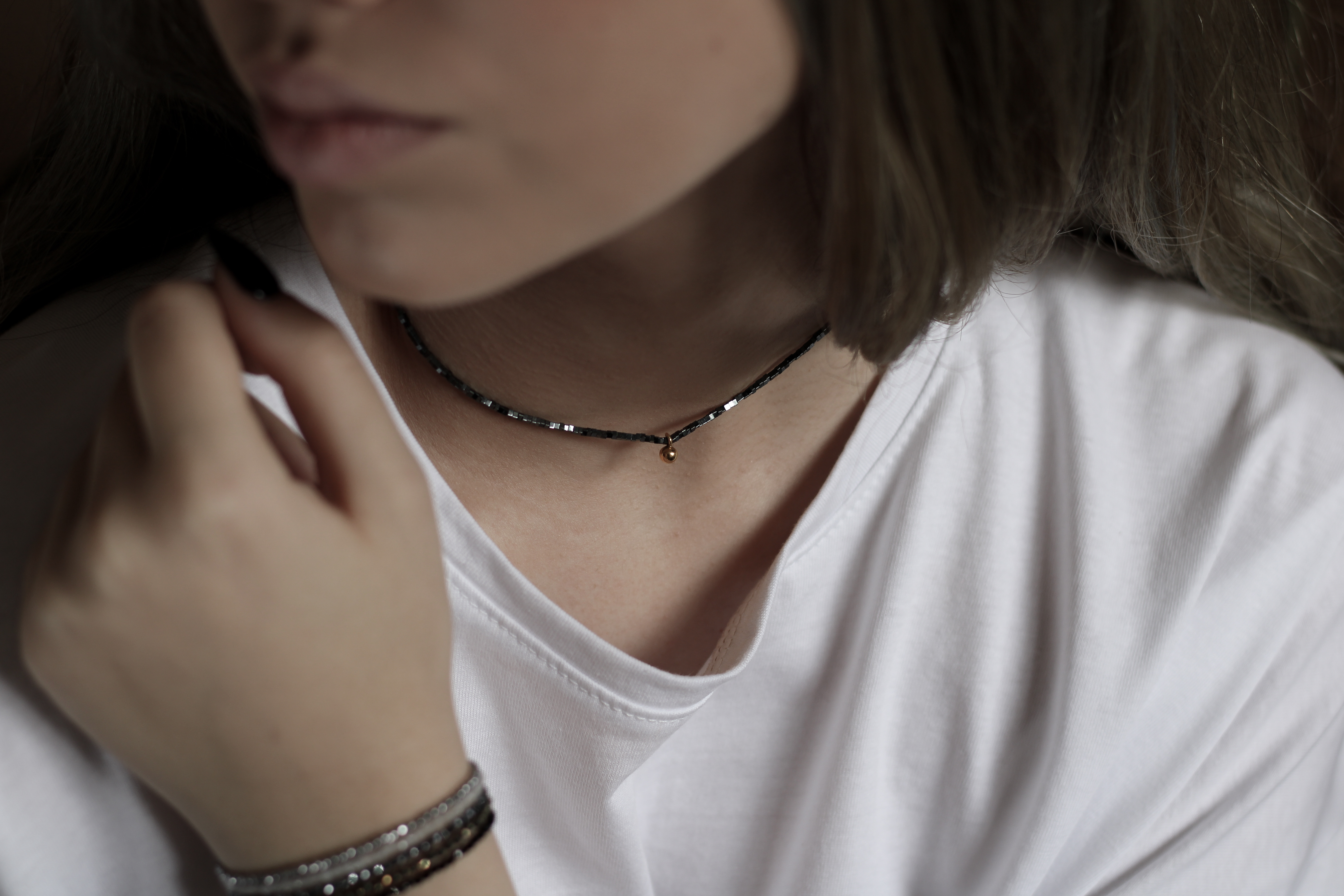 Colier realizat din pietre semipretioase, Hematite. Pantantiv, inchidere si prelungire din Argint 925 placat cu Aur 24K.